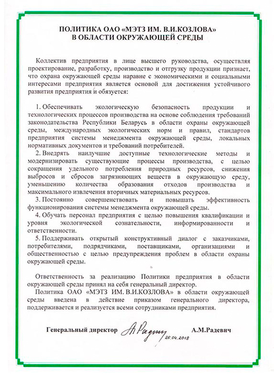 Система управления окружающей средой на предприятии сертифицирована международным органом по сертификации — “DEKRA”, Германия — на соответствие МС ISO 14001-2015.