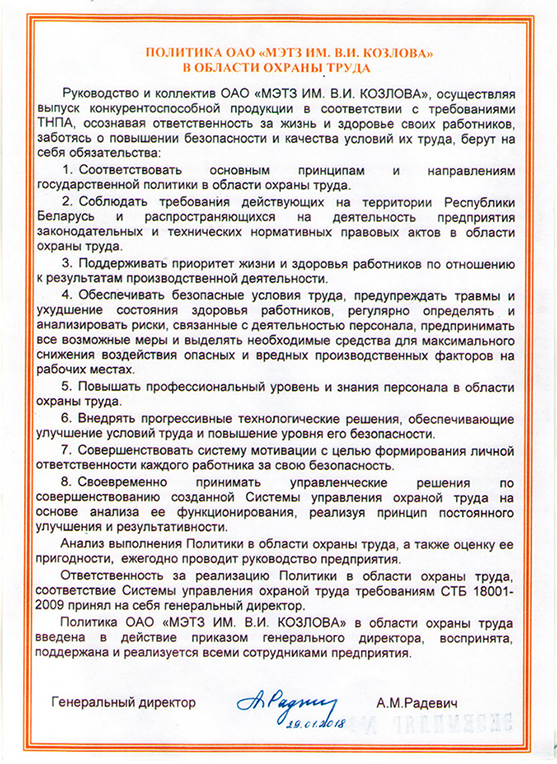 Система управления охраной труда сертифицирована в национальной системе подтверждения соответствия Республики Беларусь на соответствие СТБ 18001-2009.